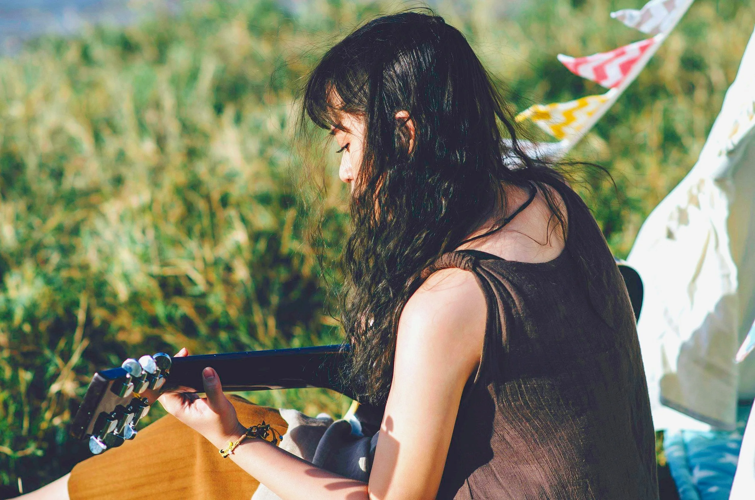 Person playing a wooden ukulele outdoors, wearing a beige top, with a blurred green background.
