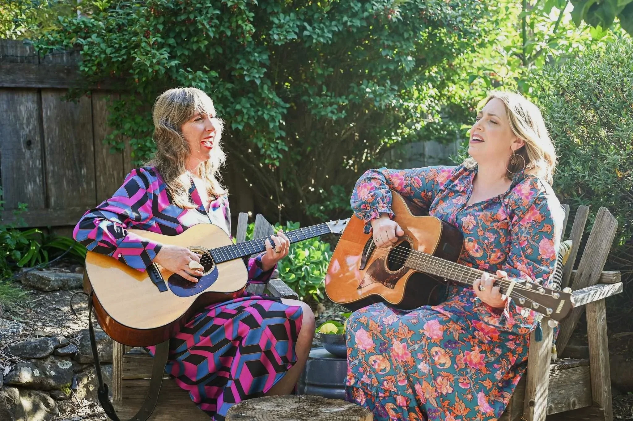 Two women playing guitars outdoors in a garden, one with curly gray hair wearing a black jacket, and the other with short blond hair wearing a denim jacket and orange dress, in front of a wooden fence.